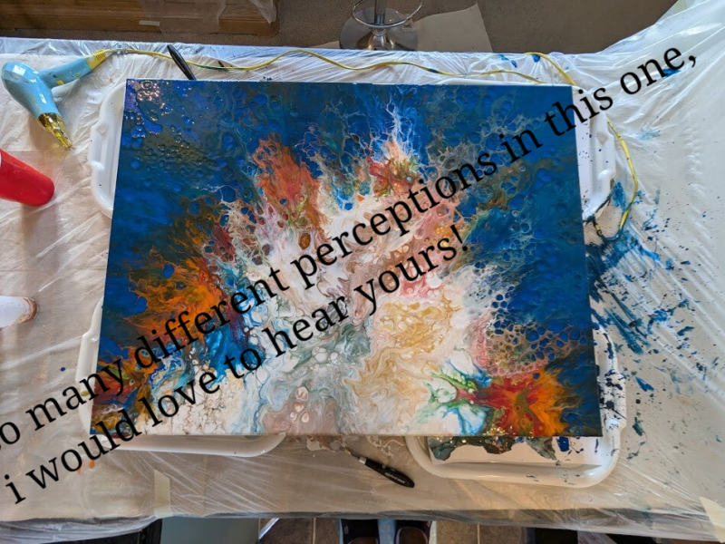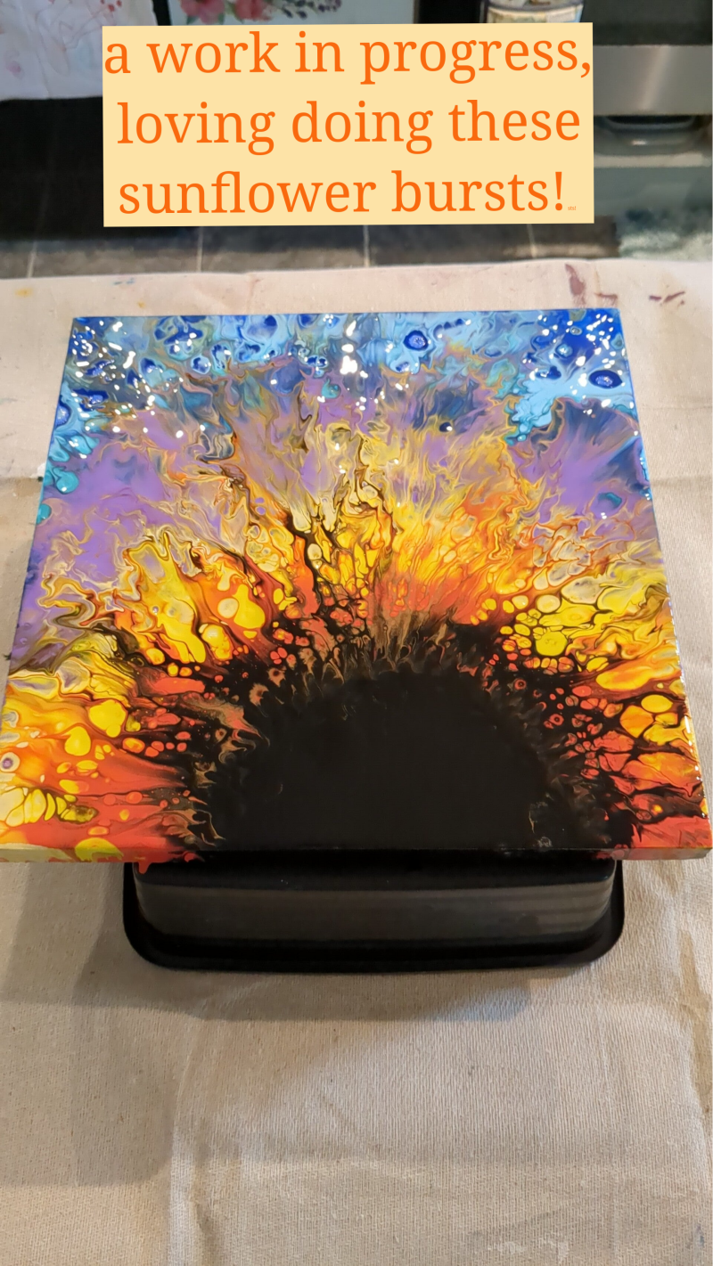 A black pour base with bright fluorescent mixed colours creating an eye catching focal point for the 'snug.