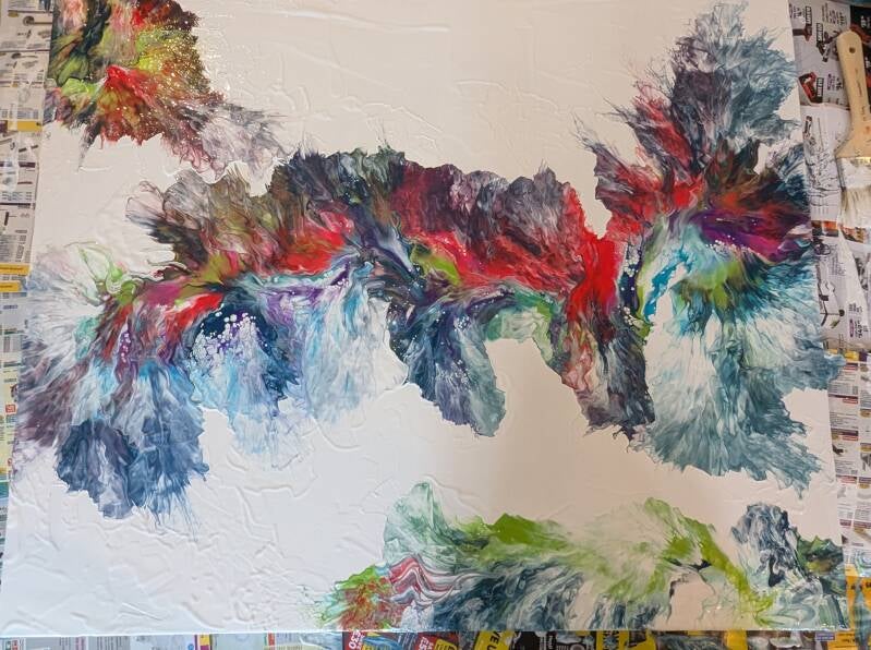 I paint to slow time, to let colours flow and find their own paths — much like life itself. Some days the brush drifts, other days it dances. What remains is honesty on canvas: imperfect, layered, and free.